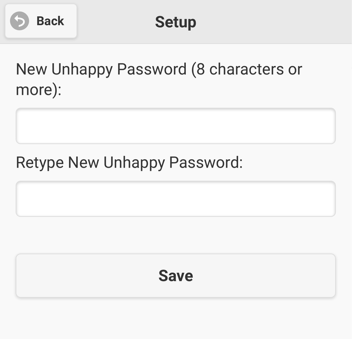 Click on 'Unhappy Password' on the main menu, screen like figure 2.6.1 will be shown. Input your new unhappy password twice, and click the 'Save' button