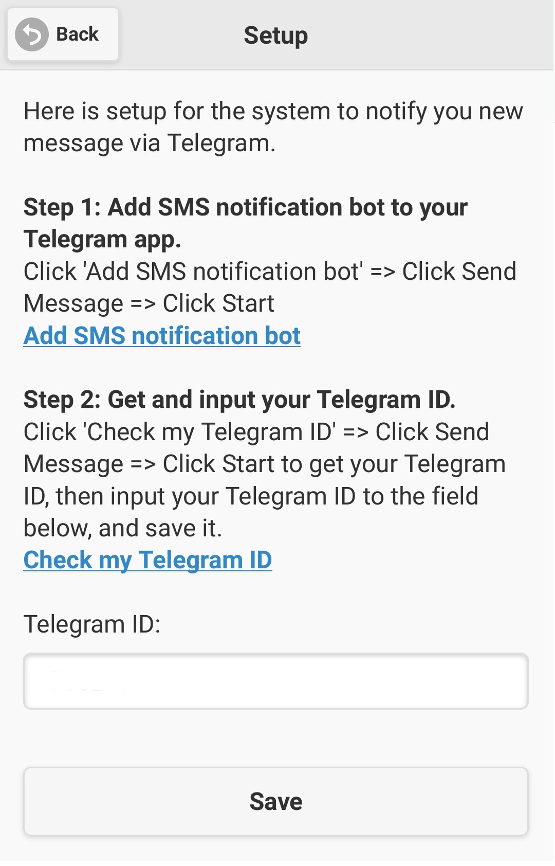 The first step is that you need to install your SMS notification bot to your Telegram. Click on the link 'Add SMS notification bot', a web page