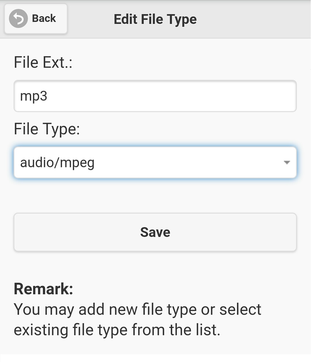 click on 'Save' button to add a new file type. You will be switched back to the file type list, and your newly added file type will be shown on the