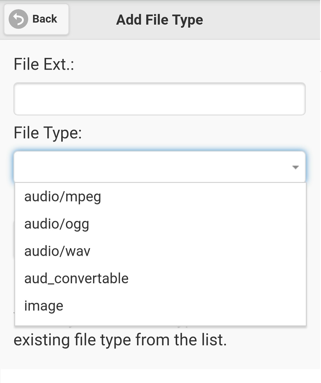 File types are defined to let SMS know how to handle uploaded files properly. Currently, there are 4 types of files, they are 'image', 'audio/{audio type}',