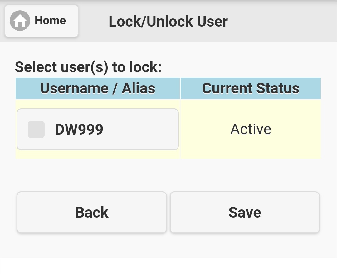 Select the check-box in front of desired user's alias, and then click 'Save' button to lock selected user(s).